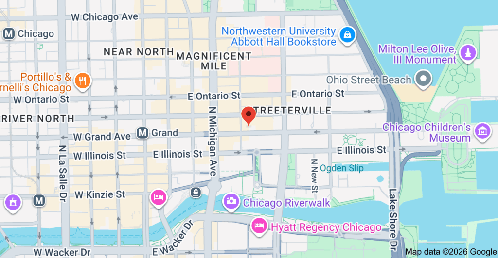 The Saint Grand is located in Streeterville and scores a 10 on the Lauren Brittanie scale. It’s across the street from Grocers and close to Parks, as well as the Lakefront.